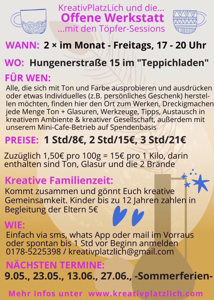 Anmelden bitte via mail: kreativplatzlich@gmail.com oder über Handy 0178-5225398 (sms/whats app).